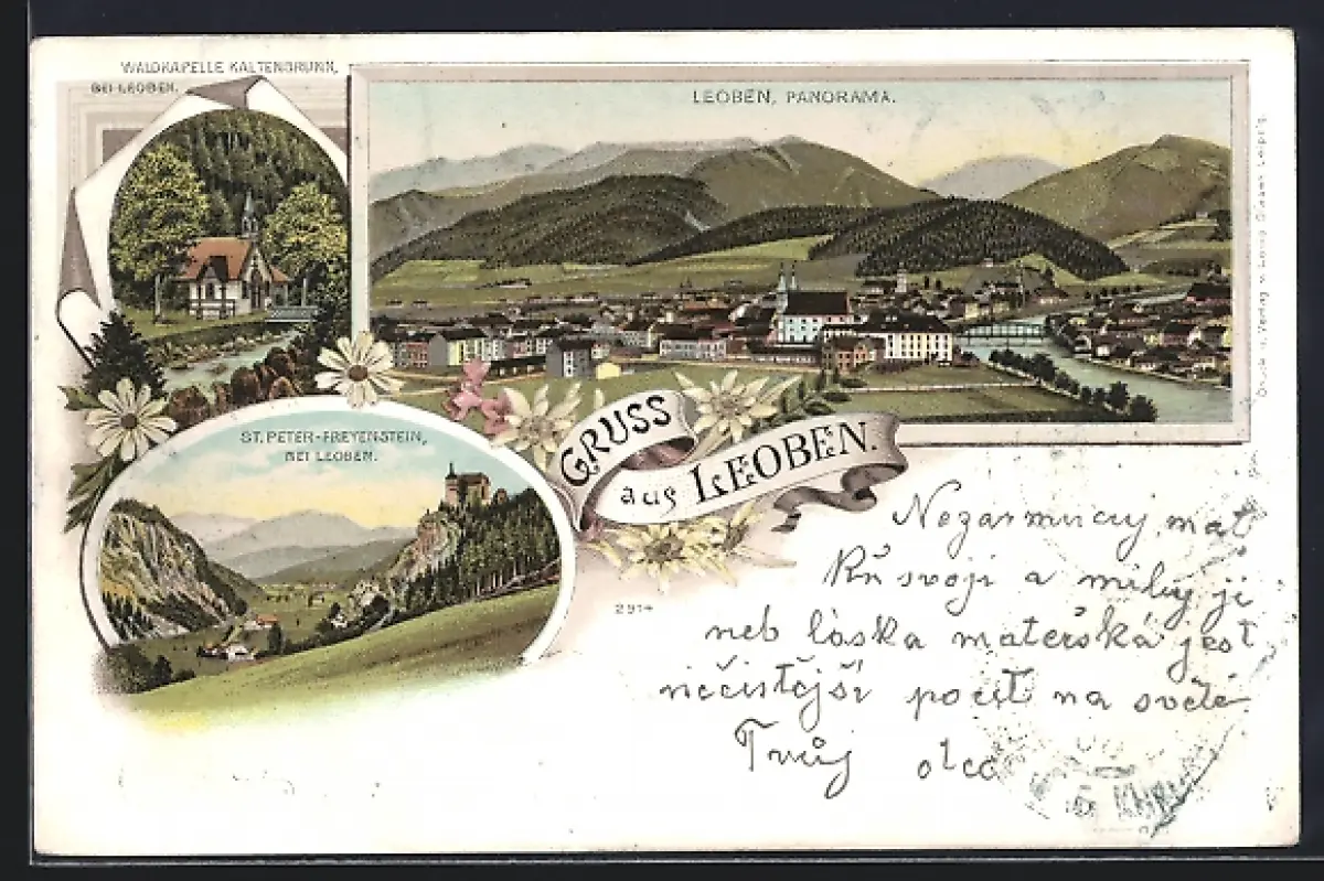 Lithographie Leoben, Panoramablick, St. Peter - Freyenstein, Waldkapelle Kaltenbrunn
