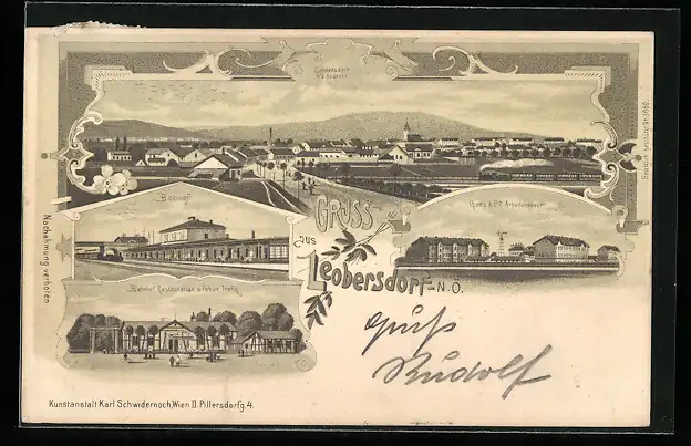 Lithographie Leobersdorf /N. Ö., Bahnhof, Restauration&Tabak Trafik, Ganz&Co. Arbeitshäuser