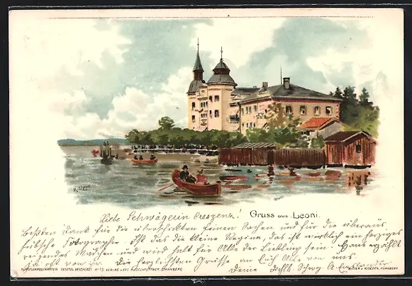 Lithographie Leoni, Ortsansicht mit Ruderboot