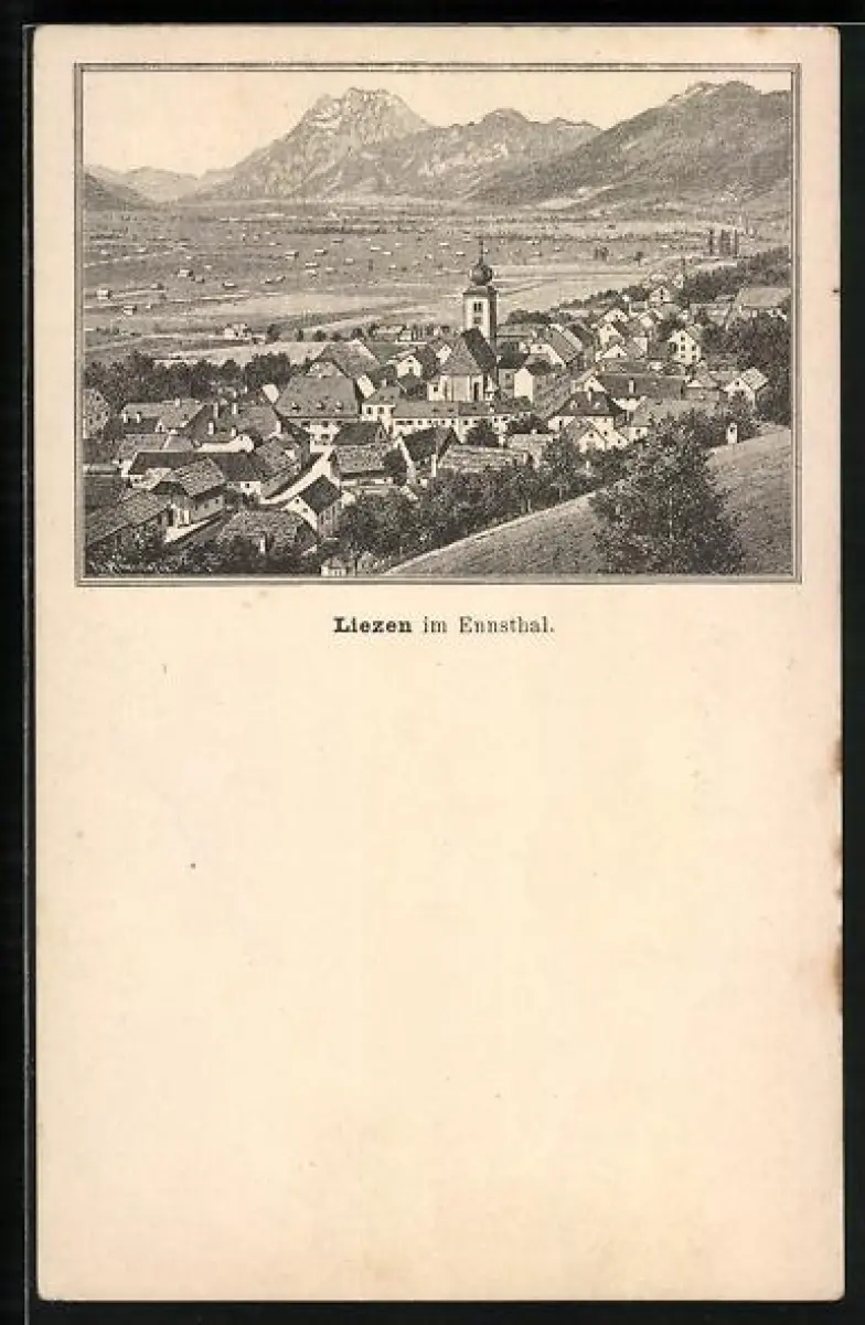 Lithographie Liezen im Ennsthal, Ortsansicht aus der Vogelschau