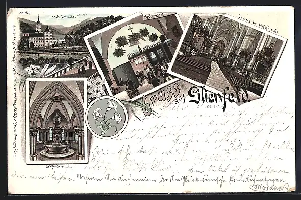 Lithographie Lilienfeld, Gasthof Kellerstübel, Blick auf das Stift, Stiftskirche