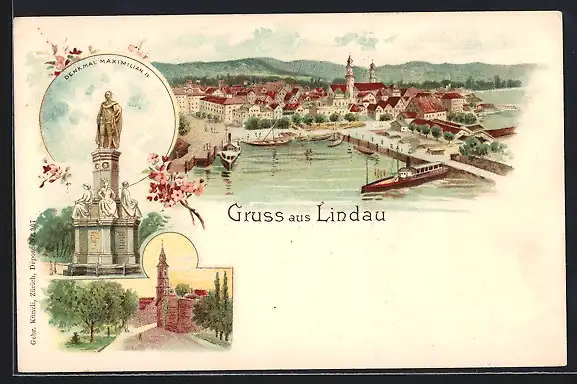 Lithographie Lindau / Bodensee, Denkmal Maximilian II., Gesamtansicht