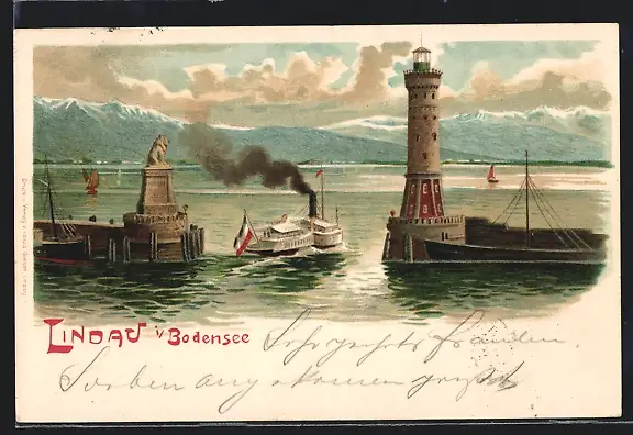 Lithographie Lindau i. B., Hafeneinfahrt mit Löwe und Leuchtturm
