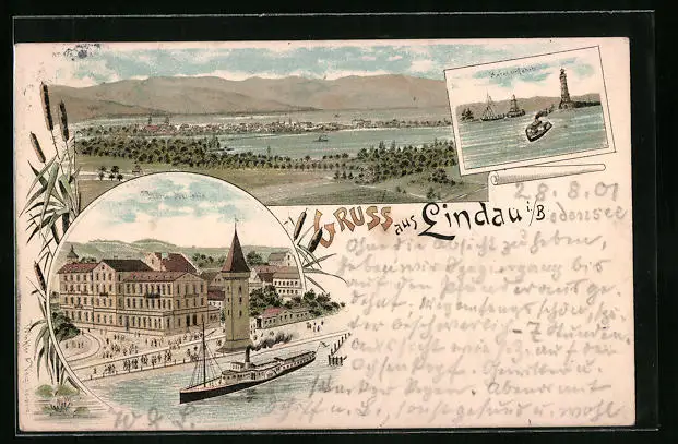 Lithographie Lindau i. B., Totalansicht mit Uferpartie