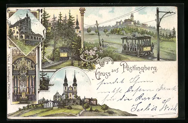 Lithographie Linz, Bergbahn zum Pöstlingberg, Kirche, Aussen- u. Innenansicht
