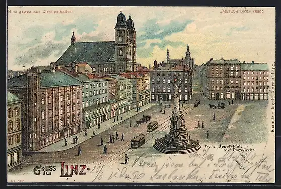 Lithographie Linz, Franz Josef-Platz mit Domkirche, Halt gegen das Licht: Vollmond