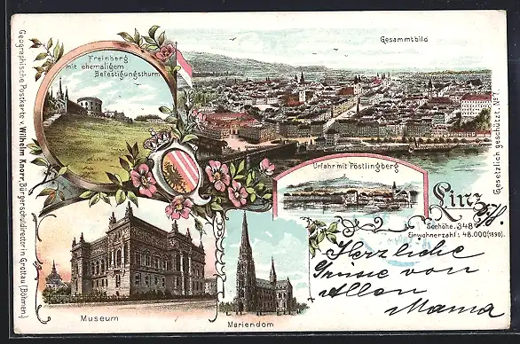 Lithographie Linz, Ortsansicht, Mariendom, Museum, Freinberg mit ehemaligen Befestigungsturm