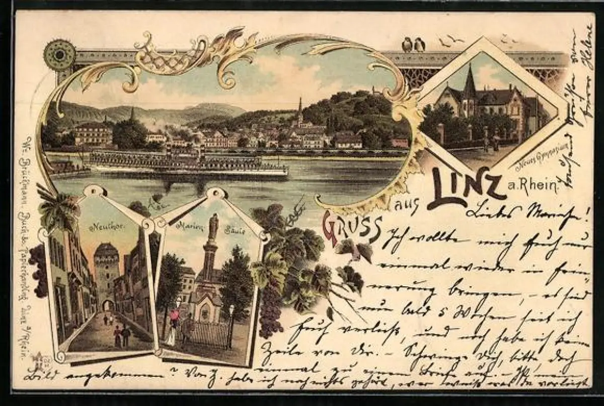 Lithographie Linz a. Rhein, Neuthor, Marien-Säule, Neues Gymnasium