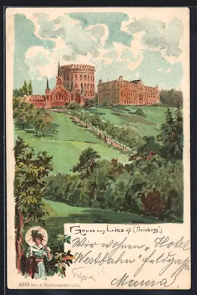Lithographie Linz a. d. D., Panoramablick auf das Schloss
