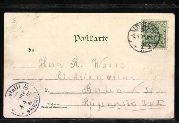 gelaufen 1901, Eckknick oben rechts, Einriss oben mittig, guter Zustand