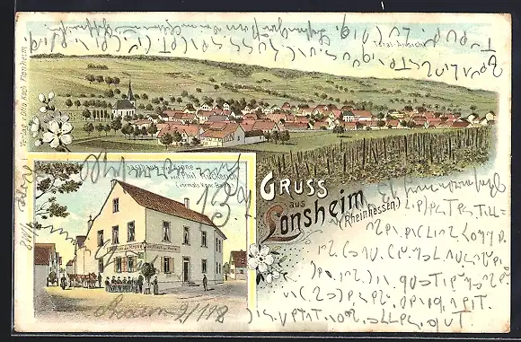 Lithographie Lonsheim /Rheinhessen, Gasthaus zur Krone v. Phil. Rückerich, Totalansicht