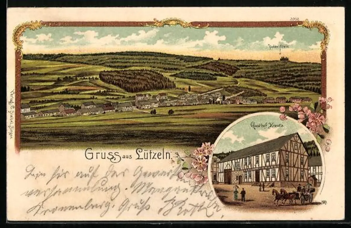 Lithographie Lützeln, Gasthof Kreutz, Ortsansicht
