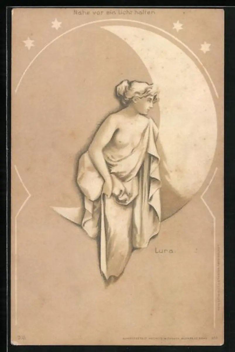 Lithographie Luna auf der Mondsichel, Frau auf dem Bett sitzend im Gegenlicht, Halt gegen das Licht