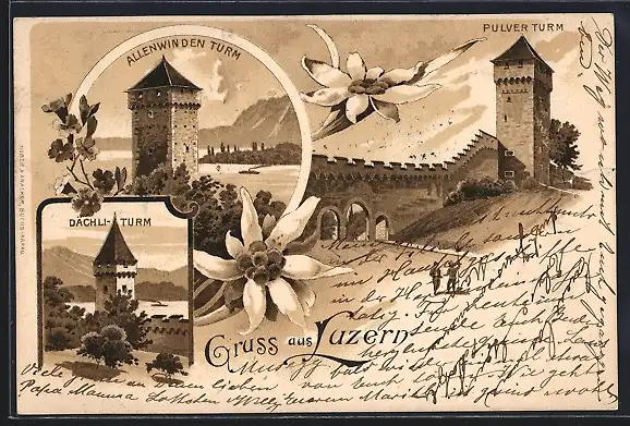 Lithographie Luzern, Allenwinden Turm, Pulver Turm, Dächli-Turm