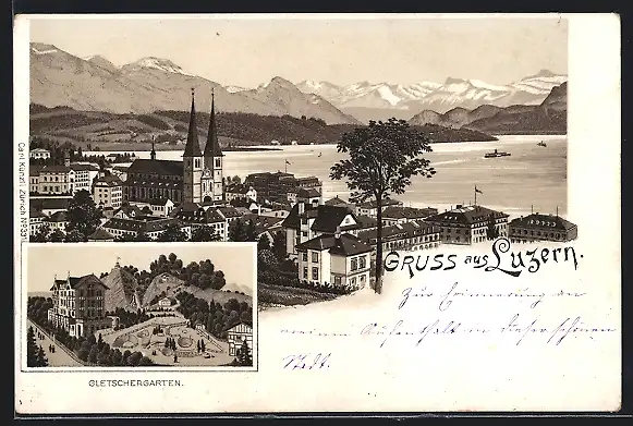 Lithographie Luzern, Gletschergarten, Stadtansicht von oben mit Seeparorama um 1900