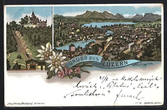 Lithographie Luzern, Ortsansicht mit See, Blick auf Zahnradbahn