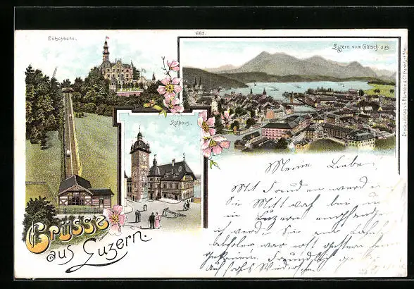 Lithographie Luzern, Ortsansicht vom Gütsch aus, Gütschbahn und Rathaus