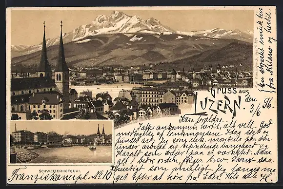 Lithographie Luzern, Schweizerhofquai und Stadtpanorama