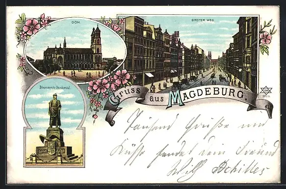 Lithographie Magdeburg, Dom, Breiter Weg, Bismarck-Denkmal