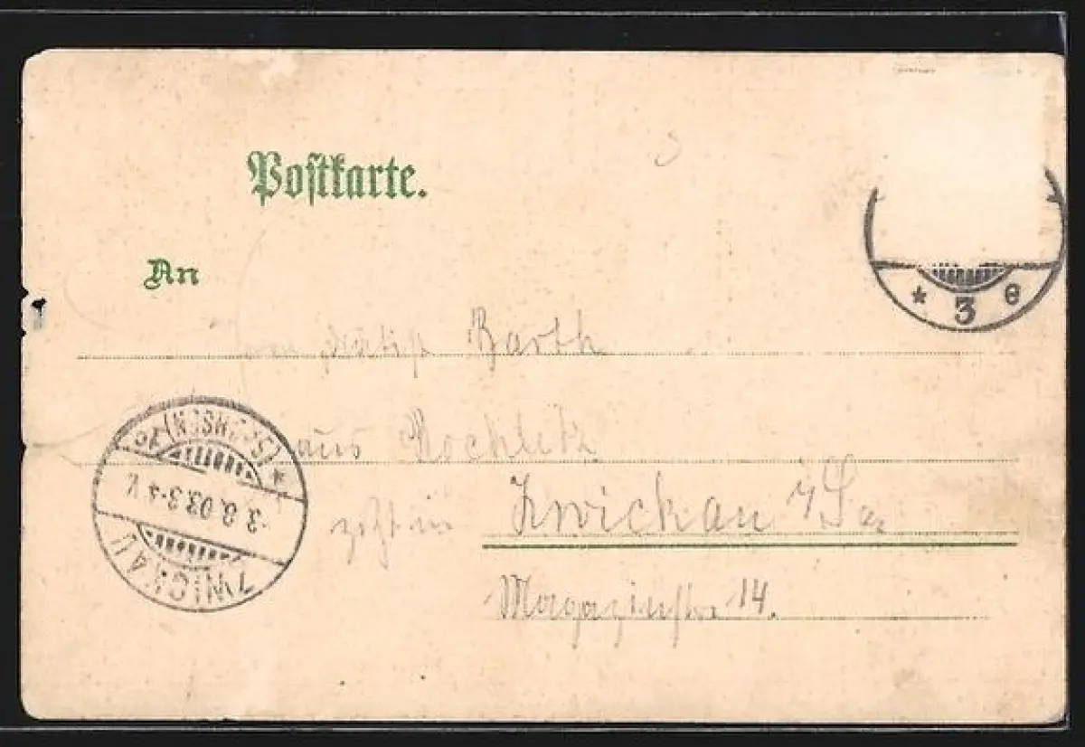 gelaufen 1903, Briefmarke entfernt, rückseitig Oberflächenschaden, Ecken bestoßen, Oberflächenschaden re. Mitte, Stempelspur, guter Zustand
