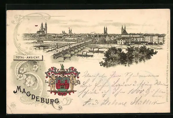 Lithographie Magdeburg, Total-Ansicht mit Elbdampfern