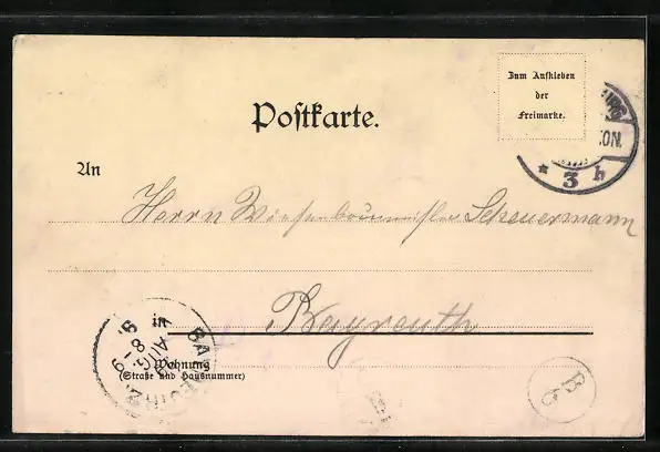Personenbezogene Daten auf der Rückseite der Karte wurden durch blauen Textmarker unkenntlich gemacht. Die blauen Stellen sind auf die Vorderseite durchgeweicht und wirken sich negativ auf das Postkartenfoto aus