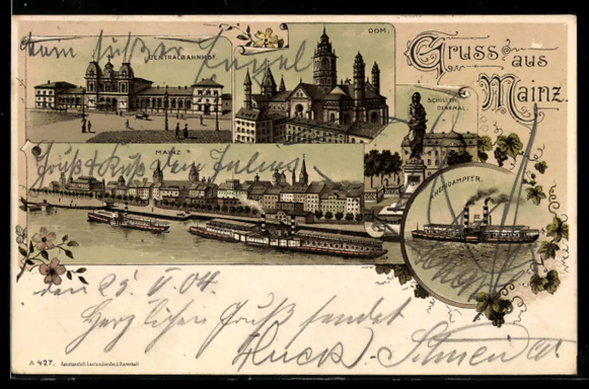 Lithographie Mainz, Centralbahnhof, Dom, Rheindampfer
