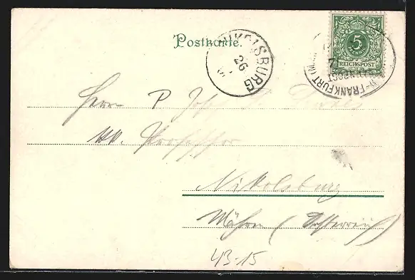 Personenbezogene Daten auf der Rückseite der Karte wurden durch blauen Textmarker unkenntlich gemacht. Die blauen Stellen sind auf die Vorderseite durchgeweicht und wirken sich negativ auf das Postkartenfoto aus