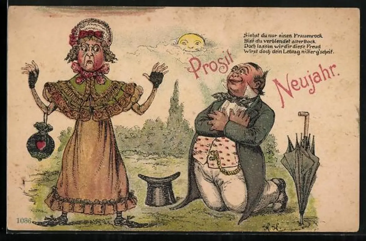 Lithographie Mann kniet vor einer älteren Frau, frauenfeindlicher Humor, früher Druck