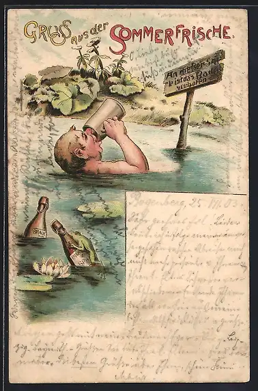Lithographie Mann trinkt beim illegalen Baden Bier