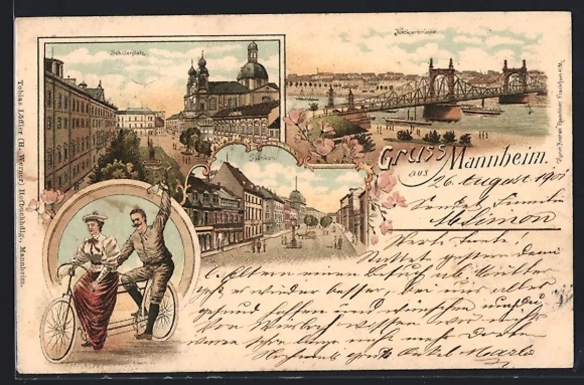 Lithographie Mannheim, Tandem mit Ehepaar, Neckarbrücke und Schillerplatz