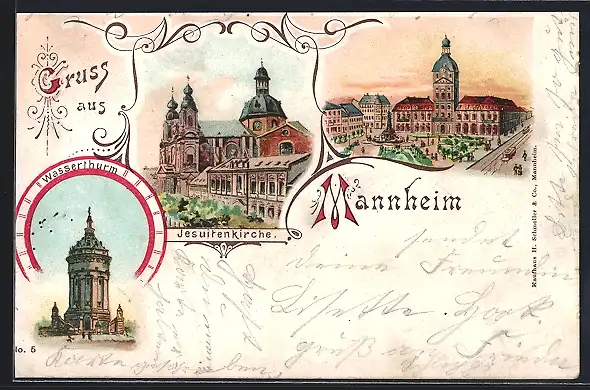 Lithographie Mannheim, Wasserthurm, Jesuitenkirche und Teilansicht