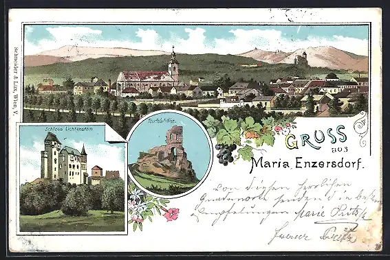Lithographie Maria Enzersdorf, Schloss Liechtenstein, Teufelshöhe, Panorama mit Kirche