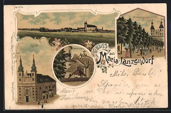 Lithographie Maria-Lanzendorf, Ansicht aus der Ferne, Kirchenplatz, Calvarienberg, Kirche