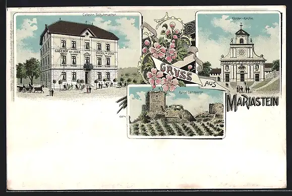 Lithographie Mariastein, Gasthof zum Jura v. Celestin Schuhmacher, Klosterkirche, Ruine Landskron