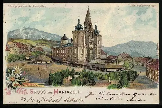 Lithographie Mariazell, Ansicht der Wallfahrtskirche, Mondschein und Gnadenbild bei Halt gegen das Licht