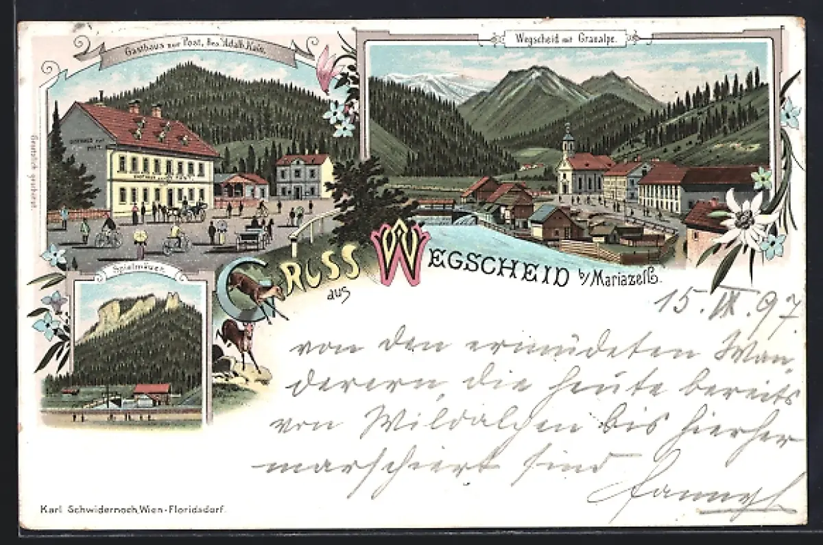 Lithographie Mariazell, Wegscheid mit Graualpe und Spielmäuer