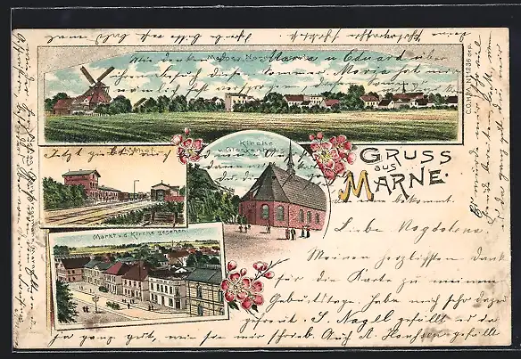 Lithographie Marne / Dithmarschen, Bahnhof, Kirche u. Glockenhaus, Markt v. d. Kirche gesehen