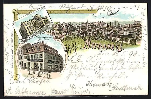 Lithographie Meerane i. S., Sortiments-Warenhaus Adolf Popper, Bürgerschule, Ortsansicht