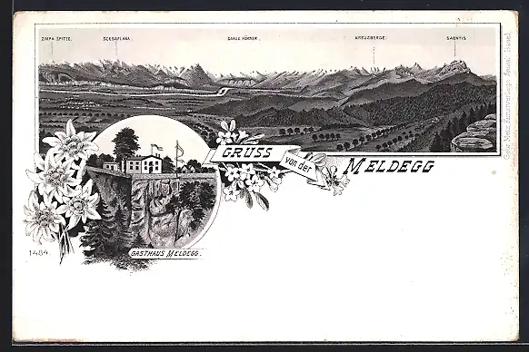 Lithographie Meldegg, Gasthaus Meldegg, Panorama mit Scesaplana, Graue Hörner und Säntis