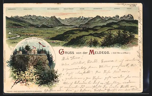 Lithographie Meldegg, Panorama mit Alvier & Säntis, Gasthaus zur Meldegg