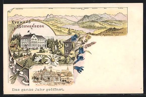 Lithographie Menzingen, Kurhaus Schwandegg, Institut Menzingen, Panorama mit Drusberg, Rigi und Pilatus