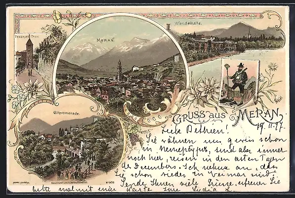 Lithographie Meran, Wandelhalle, Passeyer-Tor, Gilfpromenade, Tiroler in Tracht