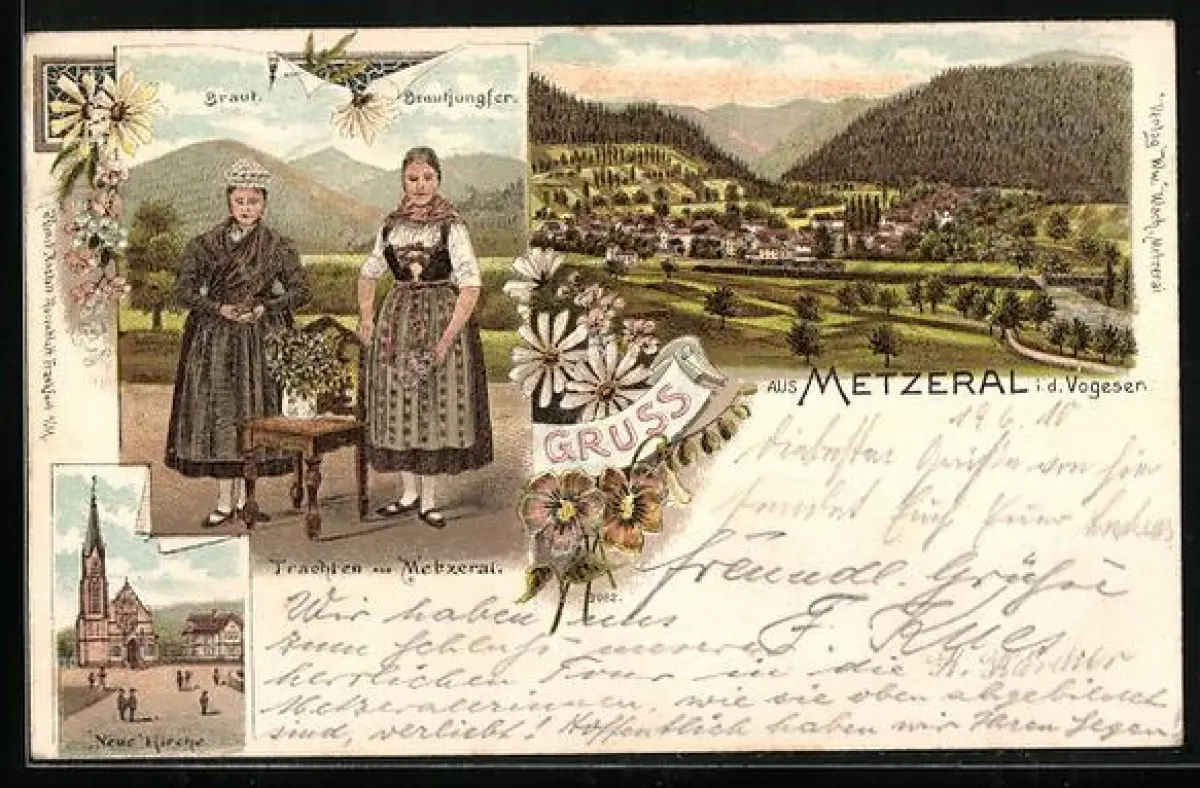 Lithographie Metzeral i. d. Vogesen, Neue Kirche, Trachten der Braut und Brautjungfer