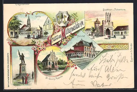 Lithographie Mittenwalde i. M., Bahnhof, Stadttor u. Pulverthurm, St. Georgs Kapelle