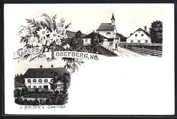 Lithographie Mitterbach am Erlaufsee, Josefsberg, J. Holzer`s Gasthof, Kirche
