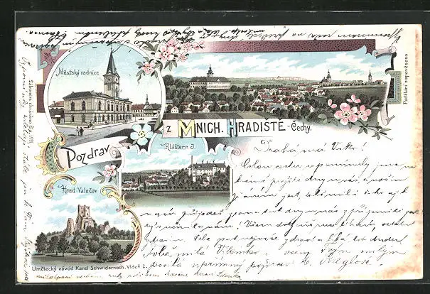 Lithographie Mnich Hradiste, Mestska radnice, Hrad Valecov, Klaster n. J.