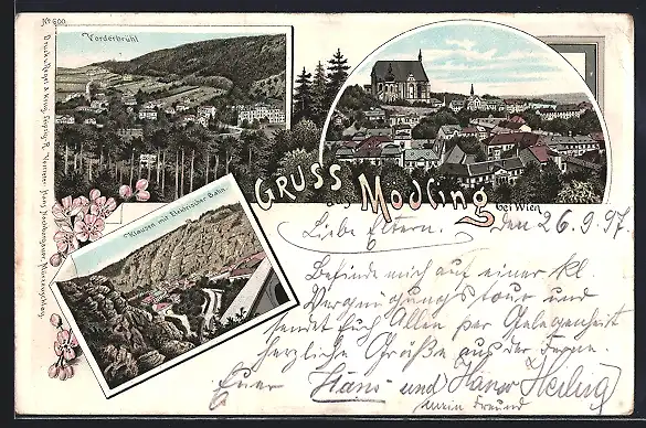 Lithographie Mödling bei Wien, Klausen mit Elektrischer Bahn, Vorderbrühl, Totalansicht