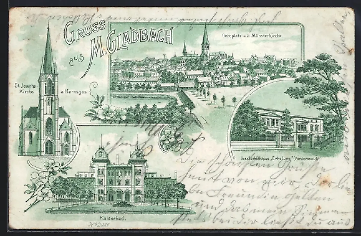 Lithographie Mönchen Gladbach, St. Josephs-Kirche, Kaiserbad, Geroplatz mit Münsterkirche