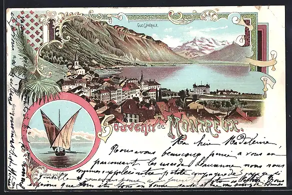 Lithographie Montreux, Barque du Léman, Vue générale